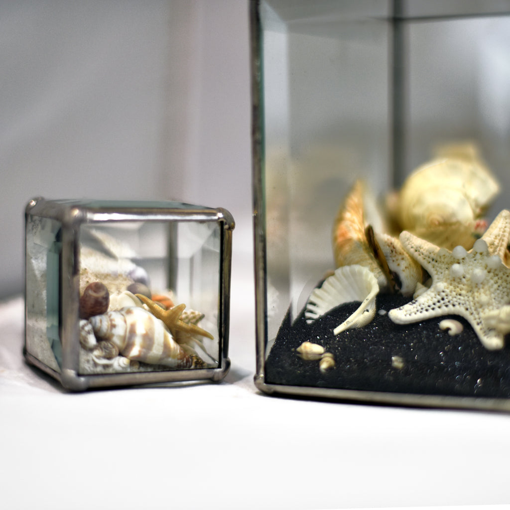 Beautiful clear glass box with beveled edges containing beach memories of your time in the islands. Shells and sand to represent your favorite St Thomas beach!